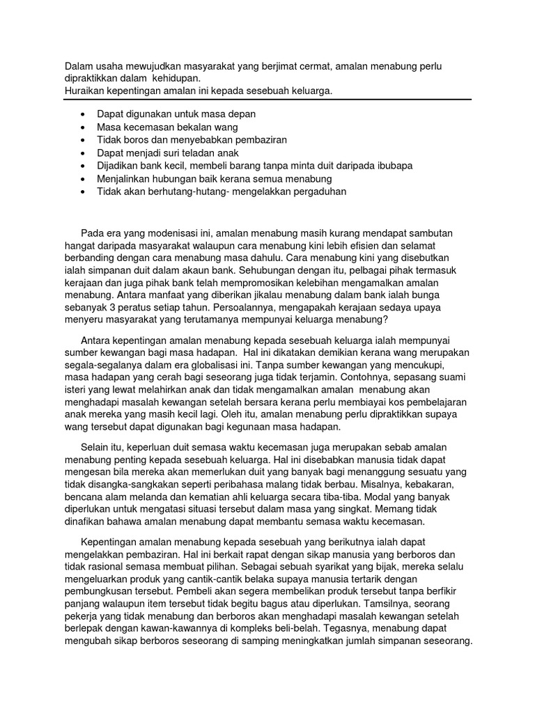 Penyelamat pada waktu kecemasan. Karangan kepentingan amalan menabung sumber kewangan bagi masa hadapan masa kecemasan bekalan wang mengelakkan pembaziran. Contoh Karangan Faedah Menabung Pdf Amalan berjimat cermat ini boleh dipupuk melalui peranan ibu bapa.